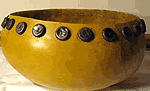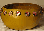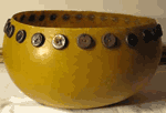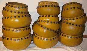 Hosho (calabash rattles): These are our authentic Zimbabwe rattles filled with hota seeds for a distinctly consistent sound. Each gourd is carefully dried and all seeds removed, inner gourd lining is carefully removed using hot water. After the cleaning, and drying, a carefully measured amount of hota seeds are added and the gourd opening is closed with a crotched patch using white yarn. Another kind of hosho is made out of the dried shell of the wild orange (damba or matamba[plural]). They are each filled with small river- bed pebbles or hota seeds. A short stick is used as a harness to keep them together as well as being used as a handle. This type of hosho is not as loud as the pumpkin gourd version, making it ideal for recording sessions. Often, the larger pumpkin version hosho can be loud enough to overwhelm the mbira in a performance or recording session. |